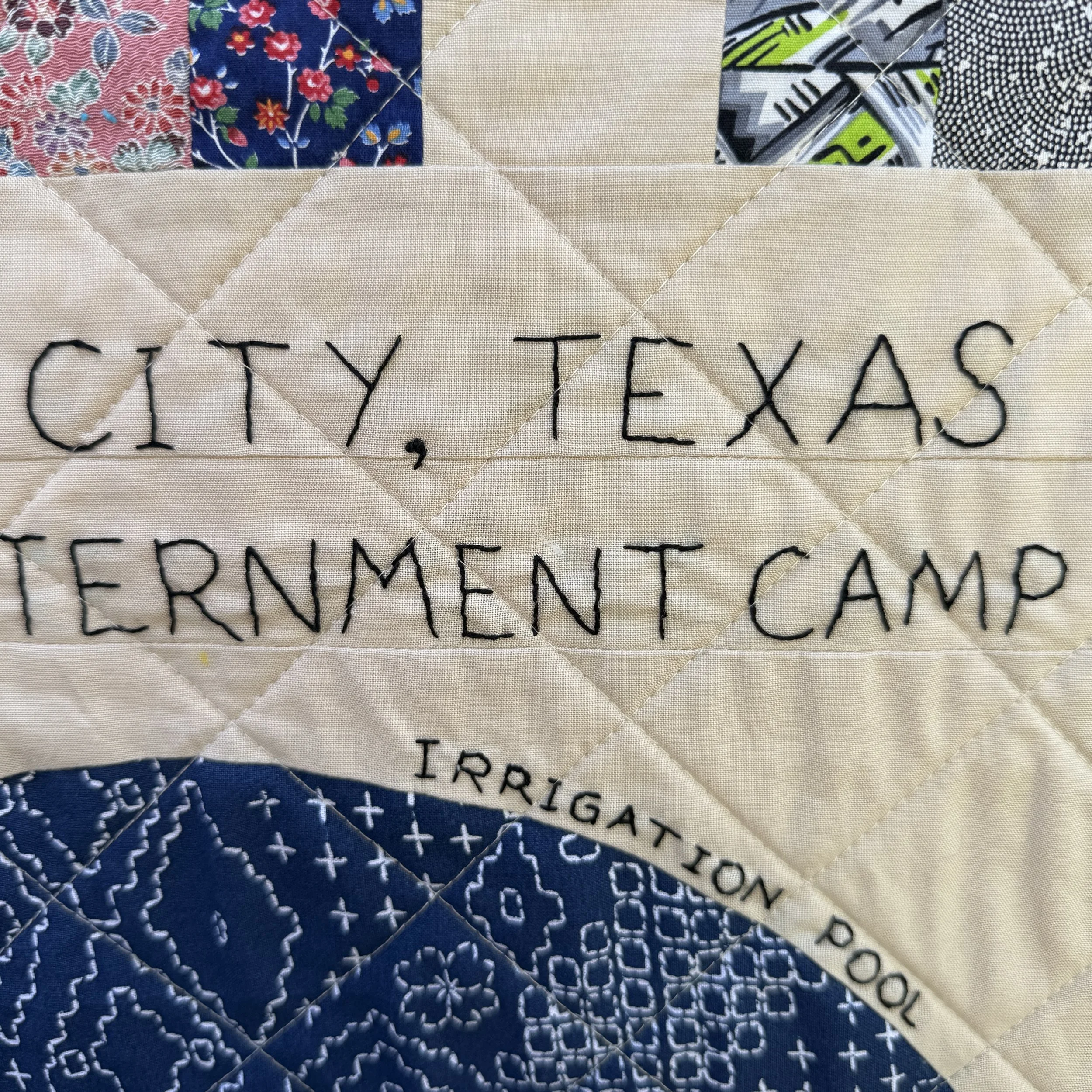 This mini quilt represents a small portion of the map of Crystal City including the spot my grandmother lived and a portion of the camp’s irrigation pool that the inmates transformed into a swimming pool. The materials used are the same as in my Poston, Arizona quilt.