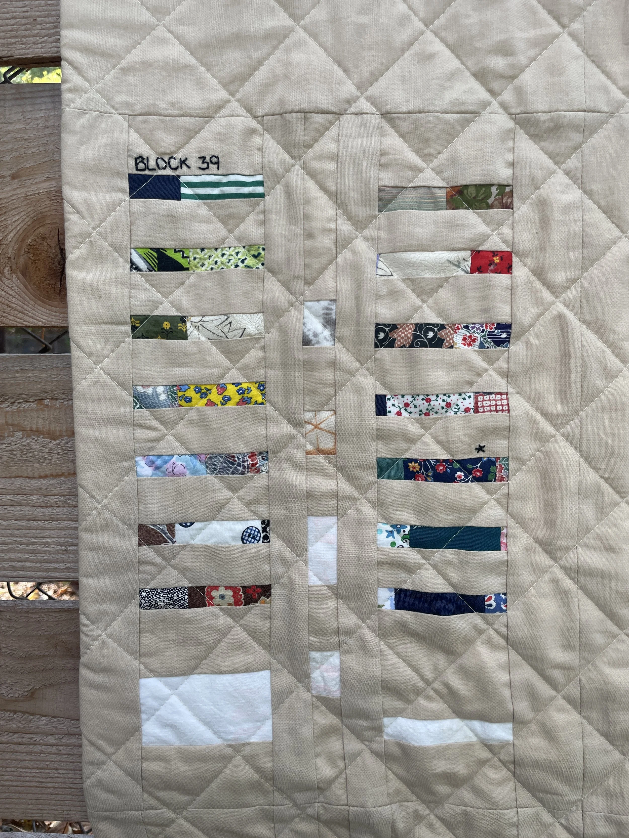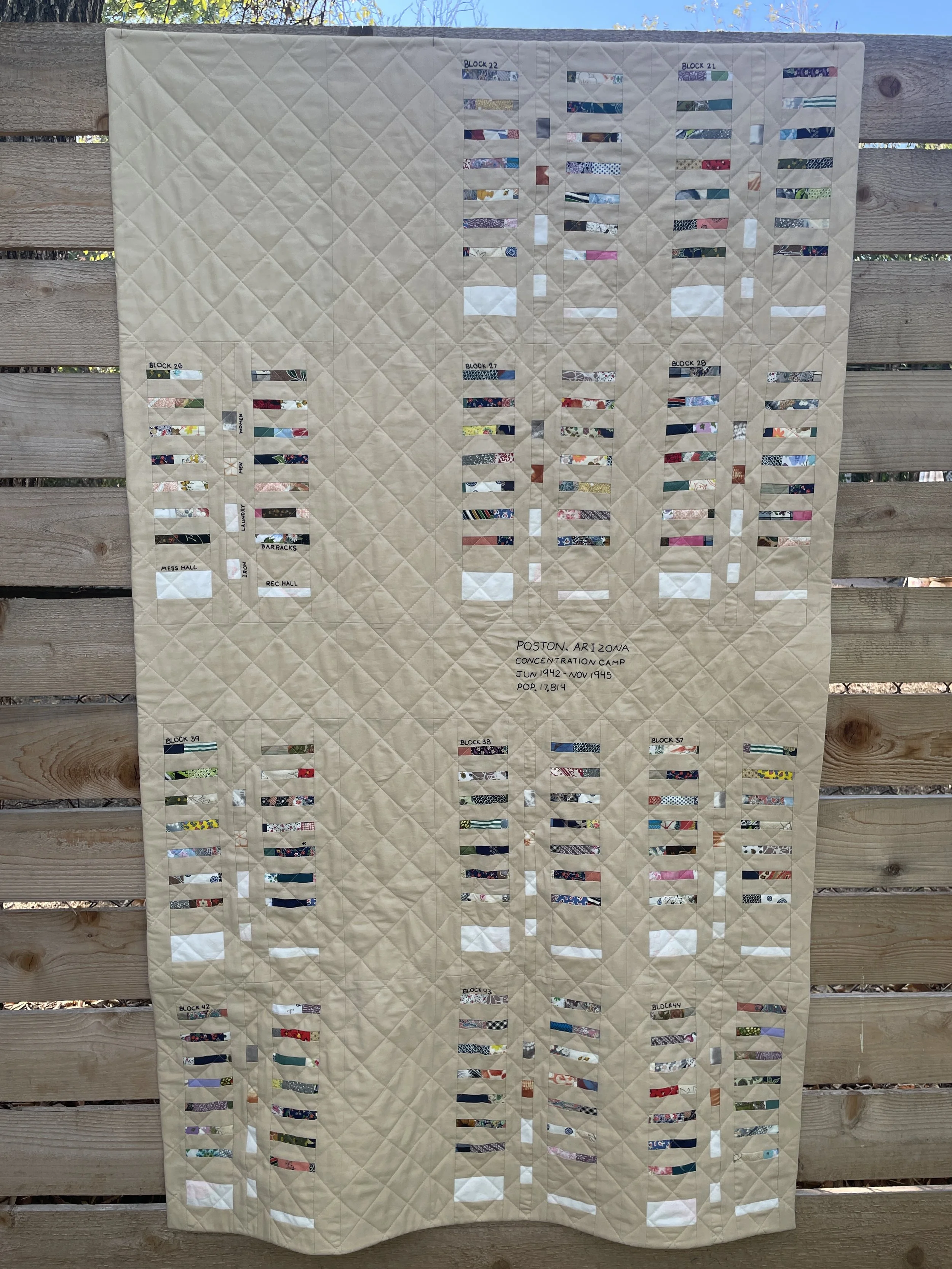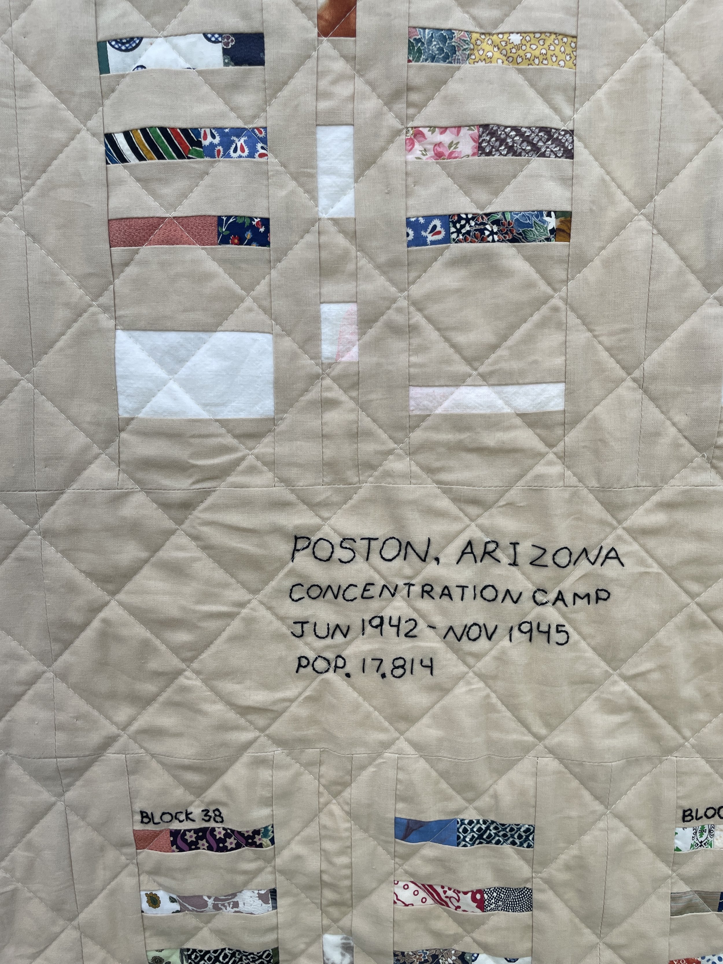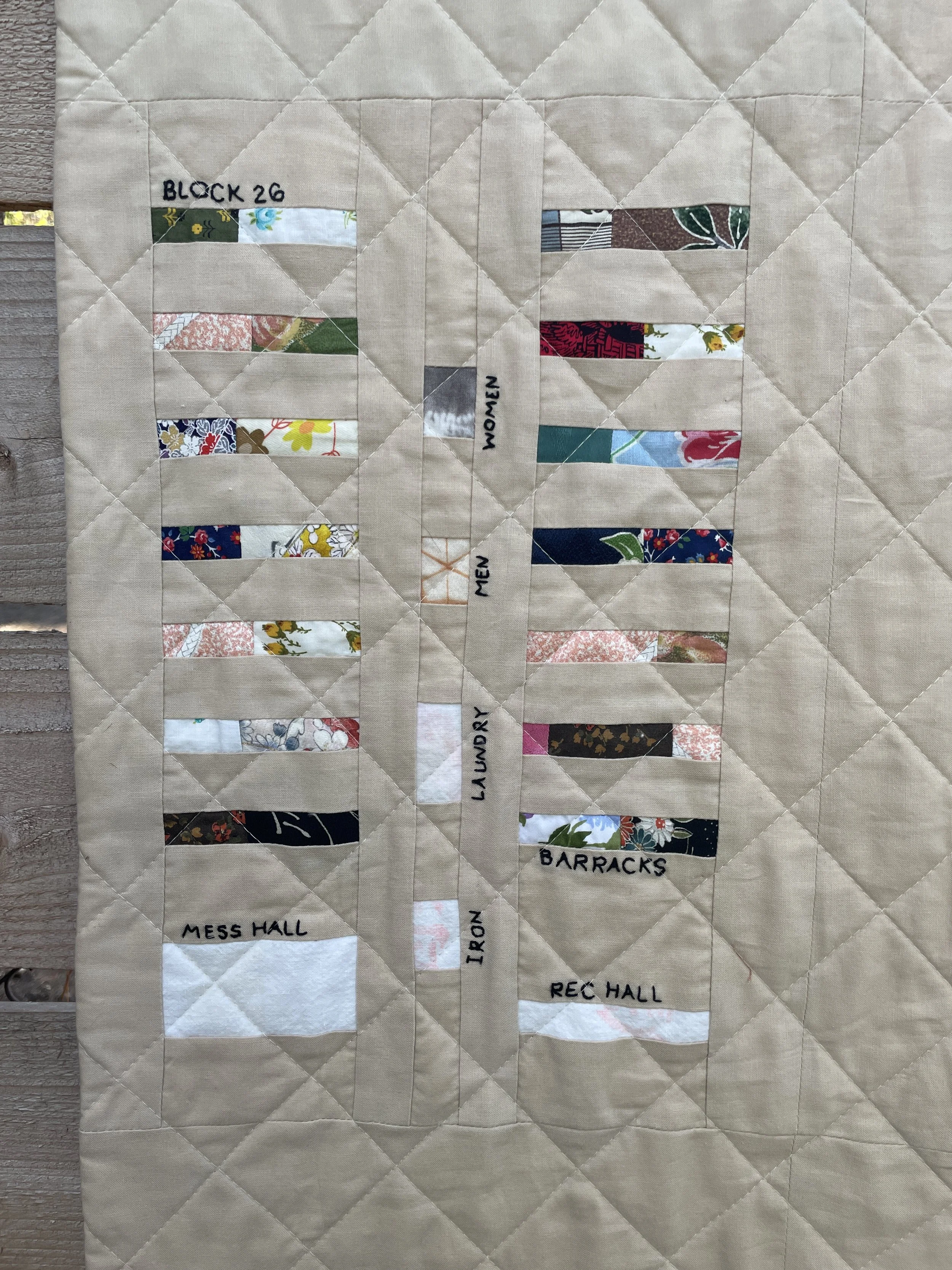 This quilt represents a small portion of the map of Poston Camp 1 where my grandmother and her family lived from 1942 through 1945. Each block comprises barracks, men'‘s and women’s lavatories, laundry and ironing buildings, and a mess hall and recreation hall. I used prewar American and Japanese fabrics to piece together the barracks and the mess and rec halls are made from rice sacks my grandmother had saved. The quilting is the same dimensions as chain link fencing.